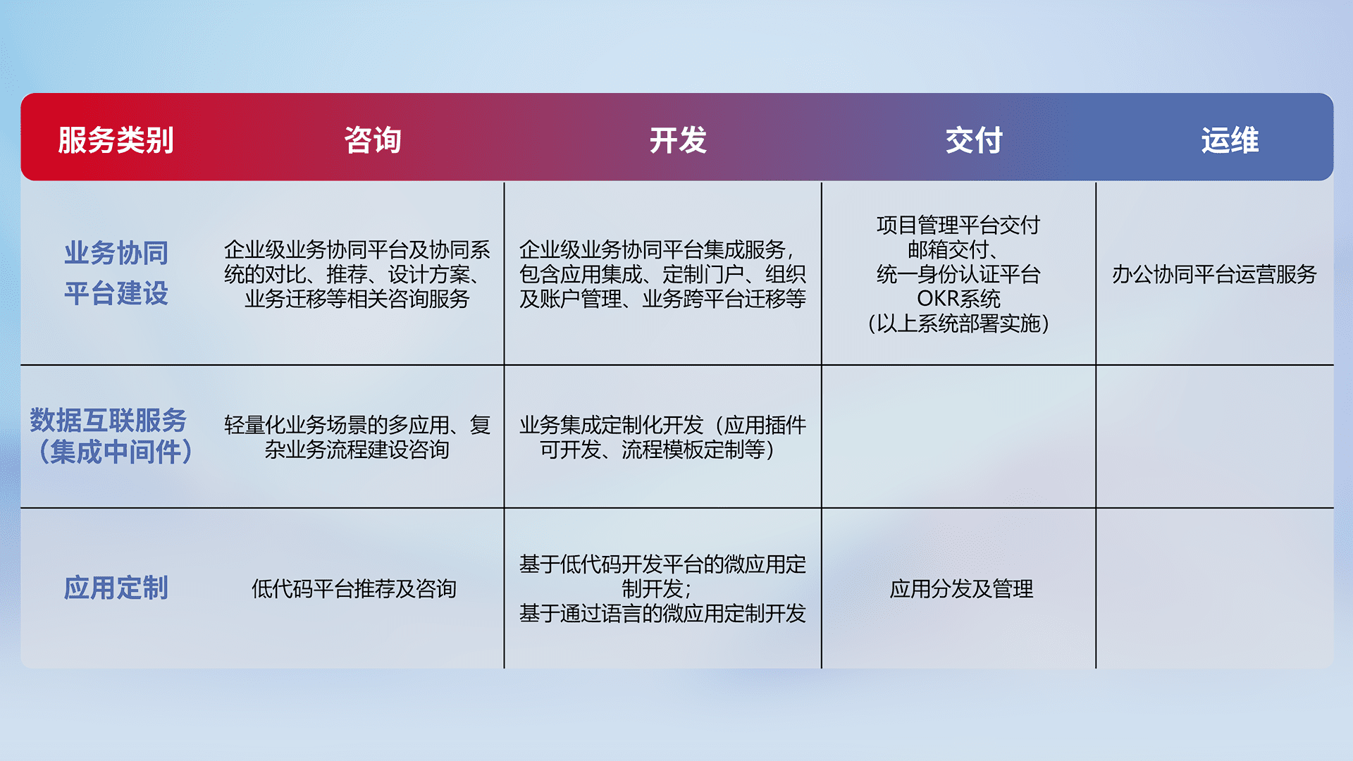 针对钉钉、、、、企微、、IDaas等平台级产品提供产品的规划、、、方案、、交付、、、定制化开发等服务,,,实现如统一协同办公、、、、智能客户服务、、、混合会议管理、、智能数据查询、、、、等业务场景,,,,实现数字化转型。。。