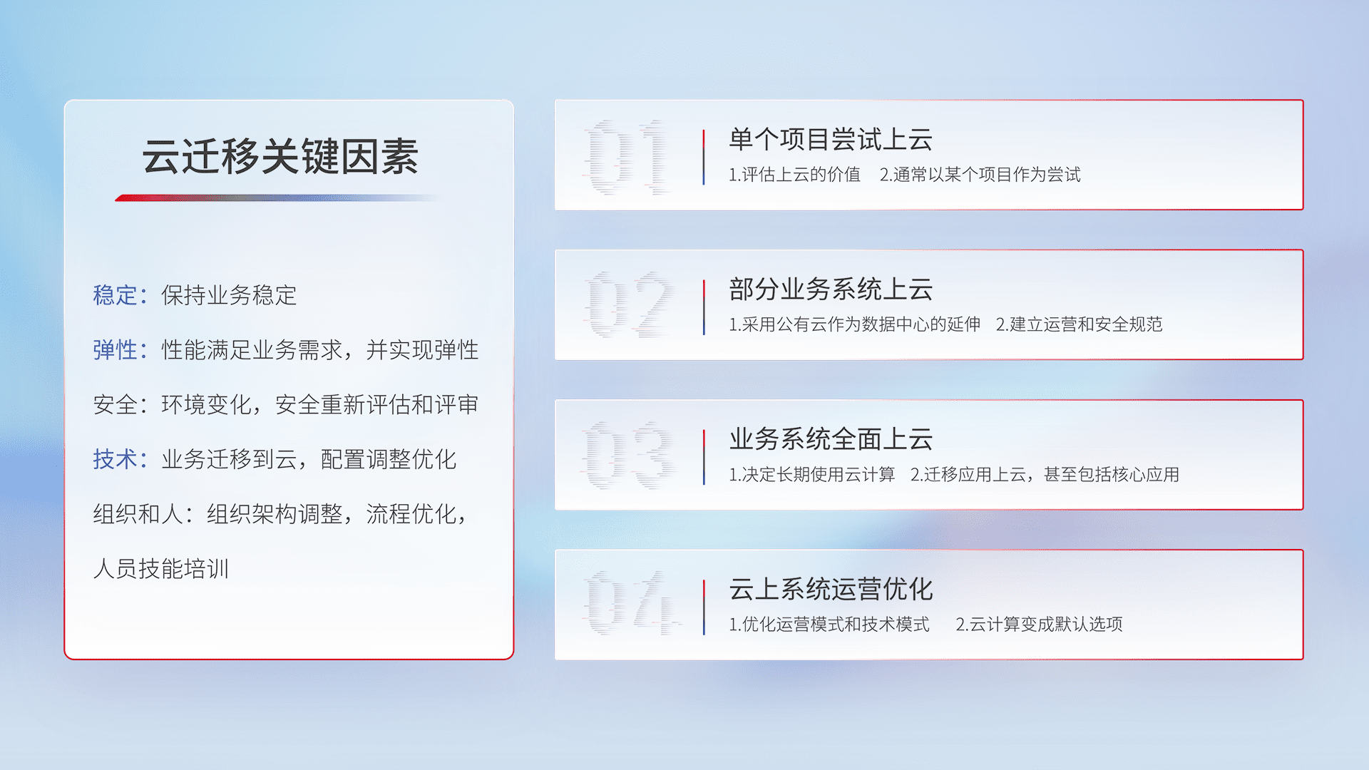 结合实际业务,,从规划设计、、云平台选型、、云原生改造、、、数据迁移、、、、集成交付,,,迁移全过程为客户识别最佳上云路径,,,做好风险识别管理,,,,设计网络架构、、身份权限、、安全审计合规、、、操作审计、、、、日志审计、、、、监控告警策略、、、、多站点容灾设计等,,对云上基础设施进行整体规划,,,提升IT治理水平,,以满足弹性、、、高可用、、高性能的需求。。。